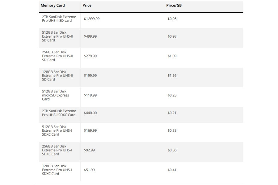 Tính theo chi phí mỗi gigabyte, thẻ 2 TB UHS-II này có giá khoảng 1 USD (khoảng 26.214 đồng) cho mỗi GB, ngang với phiên bản 512 GB trong cùng dòng, nhưng vẫn đắt hơn rất nhiều so với các thẻ UHS-I thông thường, vốn có thể xuống thấp tới 0,21 USD (khoảng 5.500 đồng) mỗi GB. Ngay cả dòng thẻ microSD Express mới hơn của SanDisk cũng rẻ hơn đáng kể nếu tính theo gigabyte.